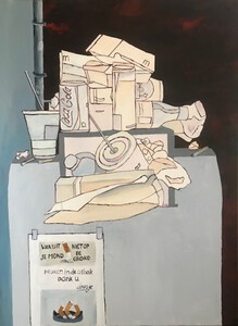 2021Trompe l'oeil met attributen die ik in Corona tijd bewaard heb om er een collage van te maken, deze collage heb ik met zelfbereide olieverf op doek geschilderd.